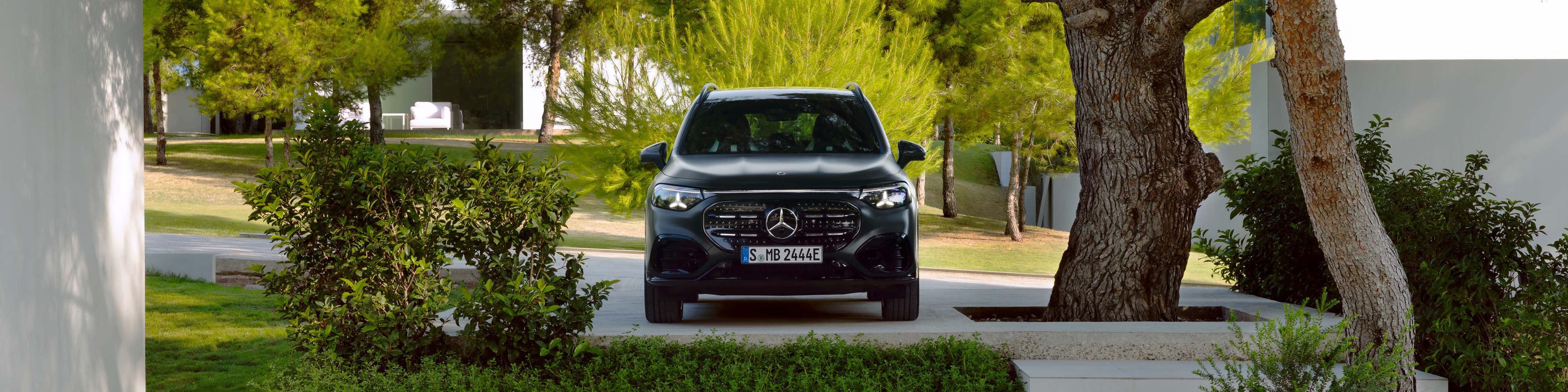 Die kraftvollen SUV-Proportionen mit aufrechter Frontpartie und steiler Windschutzscheibe sowie kurzen Überhängen prägen die Seitenansicht. Umlaufende Radlaufverkleidungen und ein optischer Unterfahrschutz vorne und hinten unterstreichen den Offroad-Charakter. Die breite Spur und die außenbündig positionierten Räder verleihen dem GLB zusammen mit der muskulösen Fahrzeugschulter einen kraftvollen Charakter. Insgesamt 94 einzeln animierte LED-Sternchen in Chrom-Optik sind die Highlights des ikonischen Kühlergrills. Je nach länderspezifischer gesetzlicher Regelung ist auch der Zentralstern ganz oder zum Teil beleuchtet. Eines der wenigen optischen Unterscheidungsmerkmale des GLB Hybrid: Er besitzt den klassischen Kühlergrill mit Mercedes‑Benz Pattern in Chrom, umrandet von einem serienmäßigen LED-Lichtleiter.