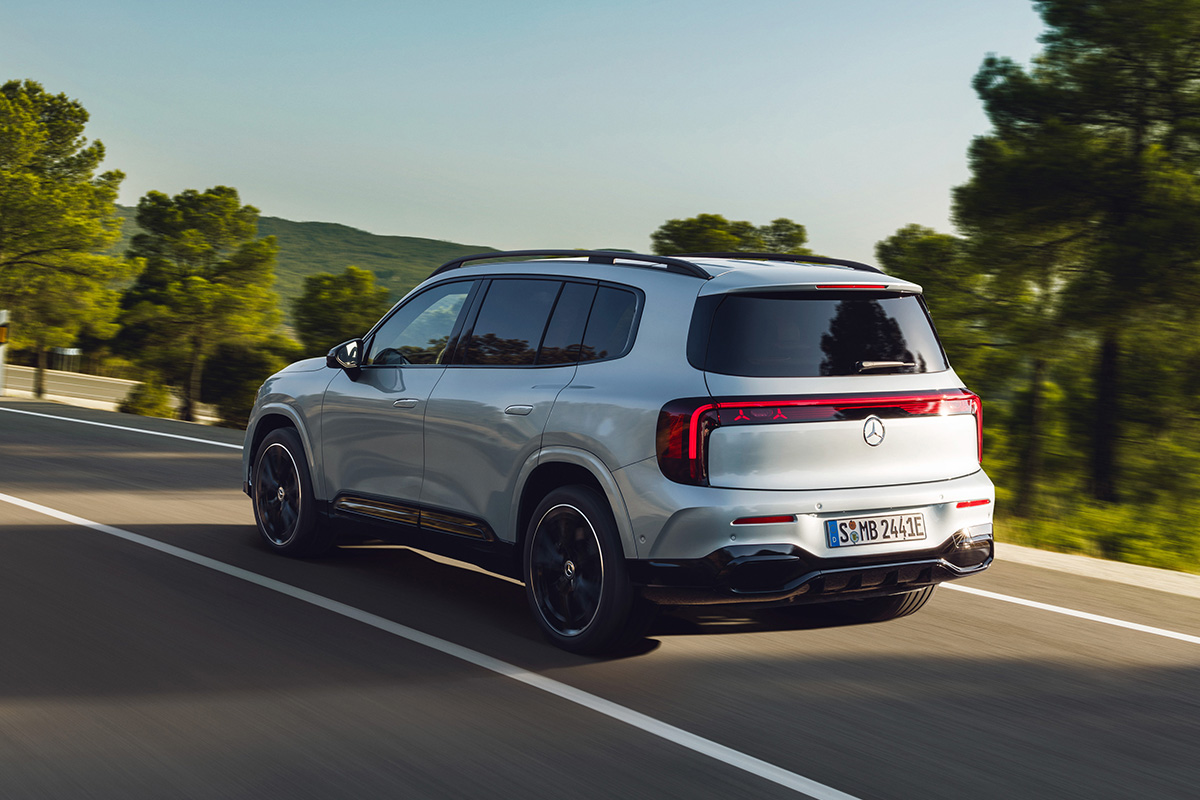 Im Vergleich zum Vorgänger bietet der neue elektrische GLB spürbar mehr Kopffreiheit in den ersten beiden Sitzreihen. Das liegt am Dachverlauf des SUV sowie dem serienmäßigen Panoramadach. Insassen dürfen sich auch über mehr Beinfreiheit im Fond freuen. Der Sitzkomfort in der zweiten Reihe wurde merklich verbessert, so ist unter anderem die Oberschenkelauflage nun länger. Und vor dem Familienurlaub brauchen Eltern nicht länger mit dem Gepäck zu jonglieren: Mit 127 Litern (104 l nach ISO 3832) besitzt das Modell den größten vorderen Kofferraum („Frunk“) der neuen Modellfamilie. Platz genug für eine Getränkekiste. Oder drei Fußbälle. Oder das kompakte Zelt. Der hintere Kofferraum fasst bis zu 540/480 Liter (Fünf-/Siebensitzer), mit umgeklappten Fondsitzlehnen sind es sogar 1.715/1.605 Liter.