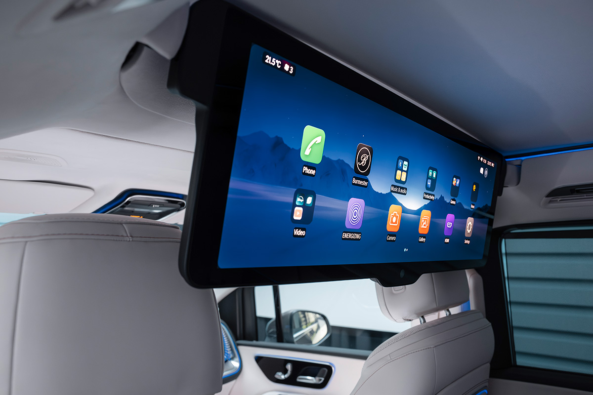 Die Passagiere werden von einem außergewöhnlichen MBUX Fond-Erlebnis verwöhnt. Ein nahtlos integrierter, ausfahrbarer 70 Zentimeter (31,3 Zoll, Ratio 32:9) großer Panorama-Screen mit Splitscreen-Funktion, 8K-Auflösung und einer integrierten Acht-Megapixel-Kamera verwandelt den Innenraum in eine faszinierende Erlebniswelt – für Entertainment oder produktives Arbeiten inklusive Videokonferenzen.